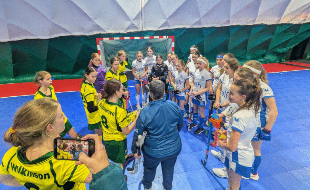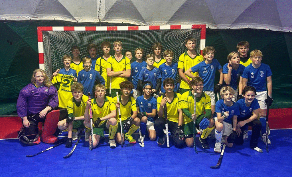 Veel van de kinderen hadden nog nooit zaalhockey gespeeld en kregen daarom even spoedcursus zaalhockey en Sebastian Archbold was zo vriendelijk om een gedeelte van de groep mee te laten doen met de eigen teamtraining van de MO16-10 om ze een beetje aan de zaal te laten wennen.